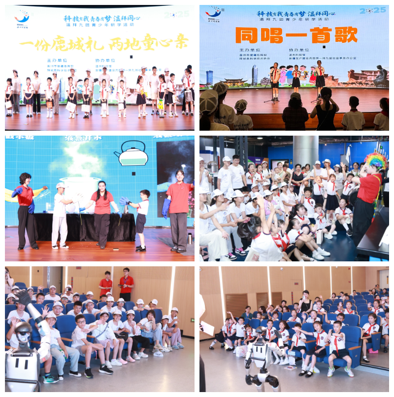 7月23日,研学团一行抵达温州科技馆,开启了一场(为期两天)沉浸式科技探索之旅。在首日的活动中研学团在科技馆讲解员的带领下进行馆内参观,首先,温州市蒲鞋市小学蒲公英健康宣讲团的小志愿者宣讲员,为拜城的小伙伴们带来精彩的科普宣讲,小朋友讲给小朋友听,通俗易懂生动有趣,既有效传播了科普知识,也在互动中悄然播撒了友谊的种子。紧接着,孩子们观看了探探实验台科普表演、趣味科普秀《这个液氮不看“冷”》、机器人和机器狗。在一系列的活动中不仅感受到“空气的力量”、探索液氮极速汽化时产生的力的奇妙作用,更沉浸式体验了现代科技的无限魅力,这些活动也激发了边疆学子们的兴趣与好奇心,在他们心中播下了求知的火种,点亮了科技梦。