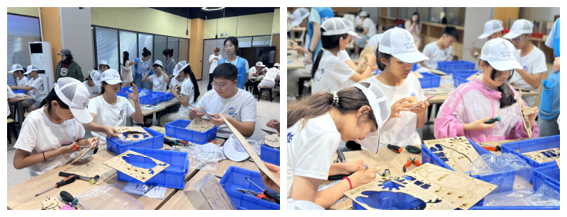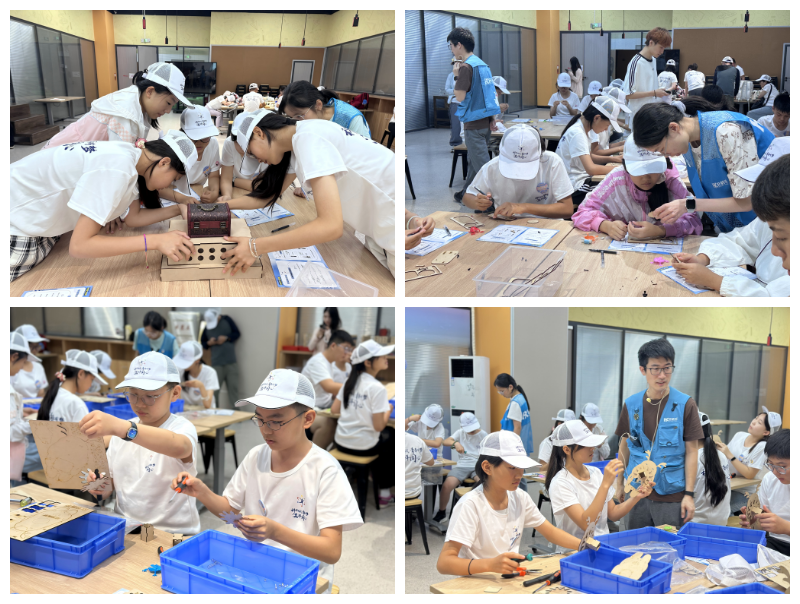 午后,在体验了一把非遗“拓印”中的科学原理后,通过“寻宝游戏”探究棘轮扳手中的齿轮奥秘,并在老师的带领下开始用工具组装调试以科技馆吉祥物“大大”为原型的创意棘轮扳手。团员们在实践中学会用工程师的思维解决问题,在闭营前分享会中,大家把研学教室变成“小小工程研讨会”,纷纷晒出自己的实践作品,分享自己的收获与感悟。