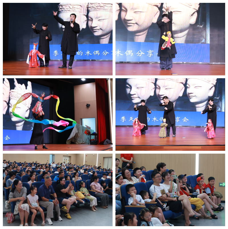 活动在季天渊、毛秀英、蔡丽静和林季聃老师们的精湛表演中拉开帷幕。科技馆的报告厅座无虚席。只见表演老师的手指牵引着根根丝线,让经典角色在方寸舞台上“活”了过来!木偶的一颦一笑、一招一式都惟妙惟肖,动作流畅自然,表情生动传神。丝线牵引下的腾挪翻转、细腻的情感表达,引得现场观众,尤其是小朋友们惊叹不已,掌声连连。