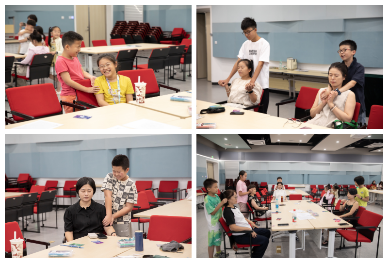 随后进入“亲子身体扫描”环节:父母坐在椅子上,孩子站在身后,跟随老师的引导词,用双手轻轻按摩父母的肩膀、手臂与背部。从感受肩膀的紧张到传递温暖的力度,每一个动作都带着专注与爱。