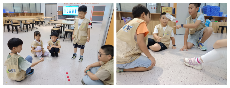 本期研学任务,是让两个看似普通的轮子在不借助牵引力的情况下实现自主奔跑。活动一开始,大家首先迎来破冰挑战:如何将装有水的塑料瓶从底部向上甩出,旋转360°后稳稳立住?孩子们跃跃欲试,却发现并不简单——第一轮尝试,没有一人成功。很快,有细心的同学发现了关键:瓶中的水量直接影响挑战结果。只有水量适中,才能在旋转360度后,更加平稳地站立在地面上。