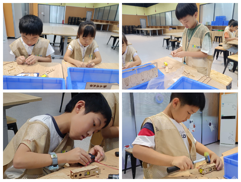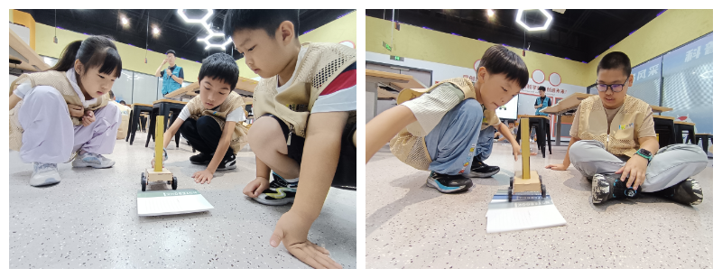 完成了这一系列的探究后,同学们迎来了终极挑战:揭秘“风火轮”奔跑机制,并亲手制作一台自己的风火轮。已经对重心这一科学概念有所了解的同学们通过观察轮轴与动力模块的运动关系开展小组讨论,并得出共识:只有当动力模块的重心与轮轴处于特定相对位置时,才能实现持续圆周运动,从而驱动轮子不断前进,实现“风火轮”的奔跑。“小小工程师”们迅速投入实践:清点零件、选择工具、规划流程、动手组装。大家为风火轮设计坚固外壳、配置动力与能源系统,不断调试优化——有的车跑偏了,有的无法前进,同学们学着以工程师的思维解决问题,在一次次失败与修正中,找到最优解法,最终收获了成功的喜悦,制作成功了属于自己的“风火轮”。