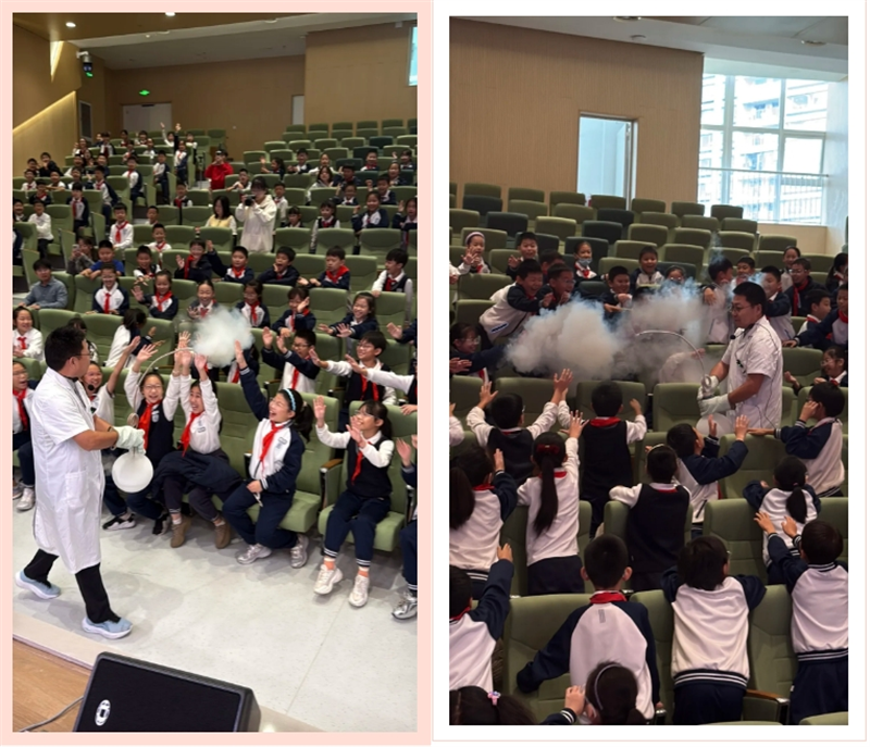 活动伊始,田老师将一支铜喇叭插入零下196℃的液氮容器,喇叭口瞬间“吞云吐雾”,液氮喷雾像白色瀑布般倾泻而下,舞台秒变“南极仙境”。“原来空气也能被冻成雪花!”同学们伸手触碰雾气,感受液氮。田老师顺势讲解液氮汽化吸热、空气冷凝原理,孩子们在“云雾缭绕”中了解“物态变化”知识。