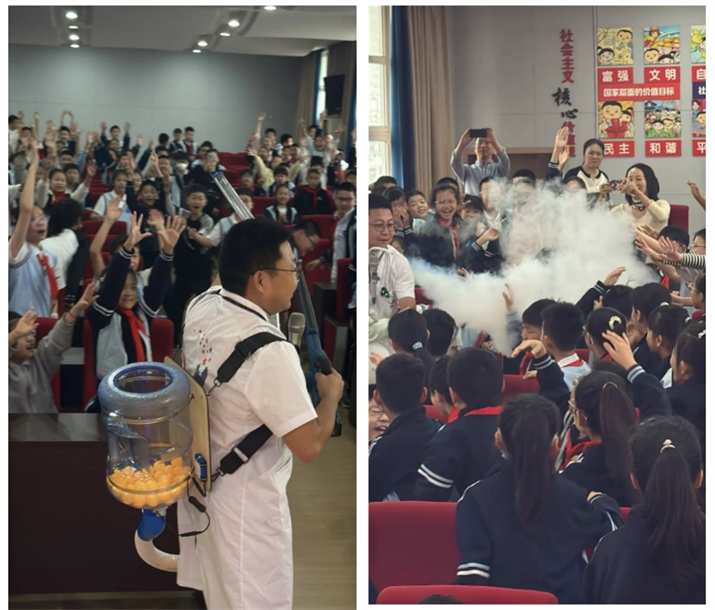 液氮吹出“冰号角”、2米塑料袋火箭比肺活量、乒乓球机关炮“火力全开”……田若平老师带领同学们走进了科学的奇妙世界,用生动有趣的语言和精准的操作技巧,将复杂的科学原理变得通俗易懂,让学生们在轻松愉快的氛围中掌握了科学知识。