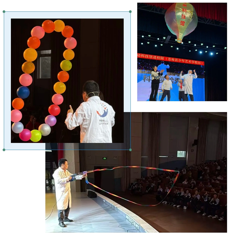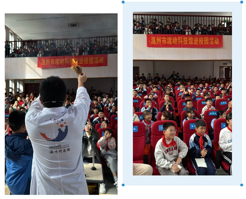 11月5日-11月13日,温州市流动科技馆分别走进文成县第二实验中学、龙港市舥艚第一小学、温州市洞头区瓯江口实验学校、温州市洞头区大门新城实验学校、瑞安市隆山实验小学、鳌江镇滨江小学、苍南县少年艺术学校、乐清经济开发区学校、温州市广场路小学,为9所学校的师生带来了精彩的科学实验秀。