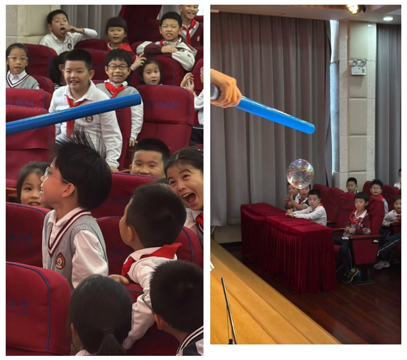 当1.5米长的铝棒被田老师用沾松香的手摩擦,尖锐的“龙吟”让全场捂耳。“声音是由振动产生的,但振动也能被‘看见’!”话音未落,静电实验隆重登场:塑料丝像被施了魔法,根根竖立成“爆炸头”;垃圾袋变成“热气球”,稳稳悬浮在孩子们头顶;五彩气球黏在天花板上,引来一片“哇塞”。最惊艳的是“静电飞花”:田老师用泡泡枪打出漫天肥皂泡,再开启高压静电,轻盈的泡泡像被赋予生命,在空中旋转、跳跃,孩子们伸出小手追逐,笑声此起彼伏。