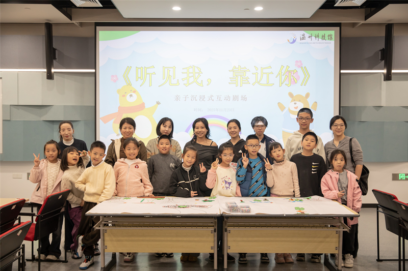 11月23日,温州科技馆开展沉浸式亲子心理互动舞台剧——《听见我,靠近你》。本次活动由音乐与戏剧治疗师、心理咨询师蔡蔡,以戏剧为疗愈载体,构建了一个安全而柔软的情感表达空间,让心声被倾听,让彼此更靠近。