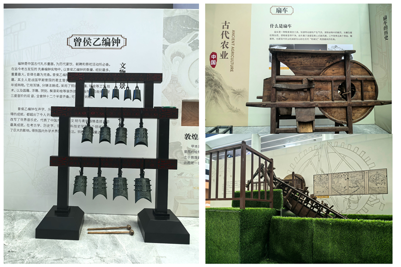 古代四大发明、龙骨水车「互动实物模型」、扇车「互动实物模型」、郑和航海「实物模型」、曾侯乙编钟「互动模型、动画」、榫卯「积木」、二十四节气「体感互动投影」、88项百科墙「拼接屏触摸互动」等。