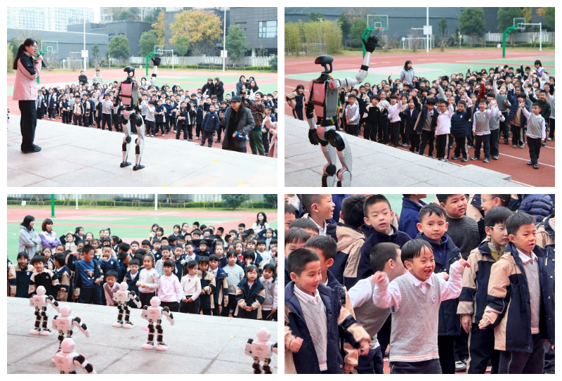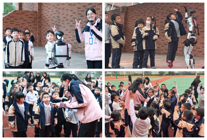活动现场,一群小机器人随着音乐旋律列队舞蹈,整个操场瞬间沸腾了,孩子们争相模仿小机器人舞蹈与小机器人共舞。小机器人精准的动作与流畅度舞姿,将科技的力量与艺术的韵律完美融合,引来台下阵阵惊呼与掌声。随后人形机器人上台与学生们展开近距离互动,孩子们排起长队,兴奋地与人形机器人击掌、拥抱,在互动与欢笑中近距离感受科技的魅力。有奖科技竞答环节,温州科技馆科普辅导员提出一个个贴近生活的科学问题,同学们争先恐后地举手回答,展现出孩子们令人惊叹的反映力和探索精神。
