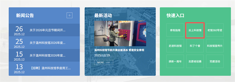 方式二:电脑端通过温州科技馆官网http://www.wzstm.com/ 通过右侧“快速入口”处点击“云上科技馆”进入。